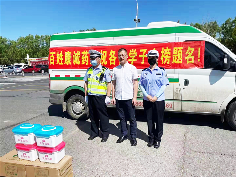 2021年6月百姓康誠藥房攜手大慶交通廣播到實驗中學考點助力高考,為交警同志帶來飲用水和應急藥品