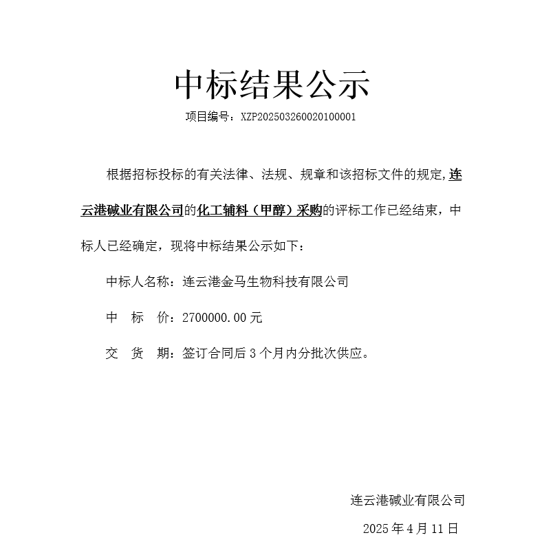 化工輔料(甲醇)采購中標結果公示