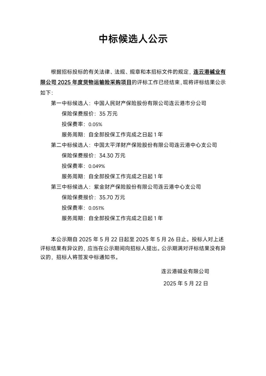 連云港堿業(yè)有限公司2025年度貨物運(yùn)輸險采購項目中標(biāo)候選人公示