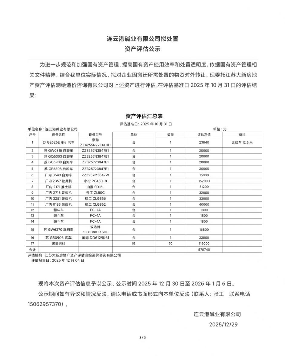 連云港堿業(yè)有限公司廢舊車輛、鋼材資產(chǎn)評估公示