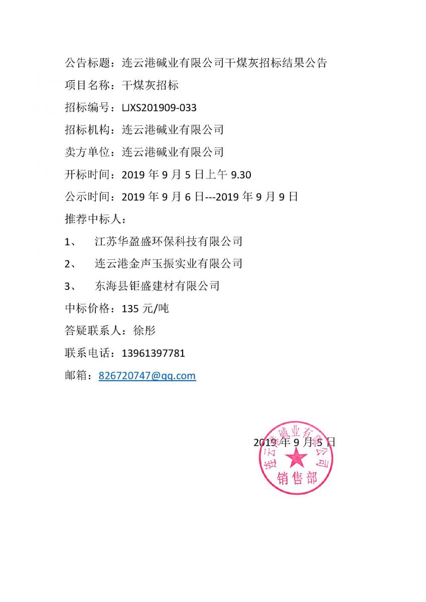 連云港堿業(yè)有限公司干煤灰招標(biāo)結(jié)果公告