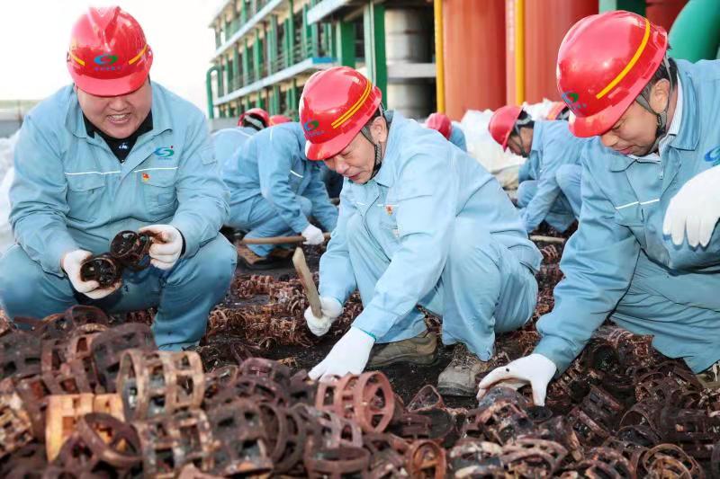 勞動現(xiàn)場,大家有的用木棍敲打填料,有的裝填包裝袋,有的將裝袋的填料擺放整齊……一個個忙得不亦樂乎。三個多小時終于完成了所有填料的清理工作,不僅解決了基層的困難,為蒸餾塔的檢修節(jié)約了時間,并且共回收可用填料25立方,為企業(yè)節(jié)約了一筆可觀的費用。