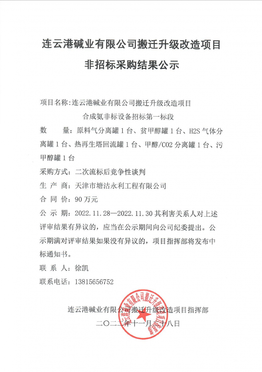 合成氨非標(biāo)設(shè)備招標(biāo)第一標(biāo)段非標(biāo)采購(gòu)結(jié)果公示