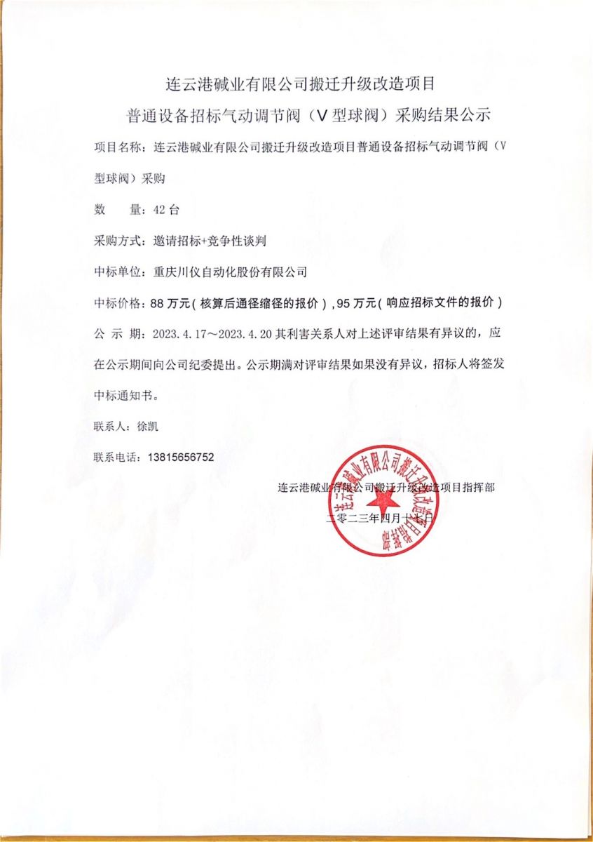 氣動(dòng)調(diào)節(jié)閥(V型球閥)采購結(jié)果公示