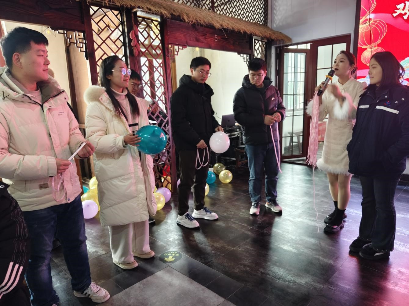 聯(lián)誼活動正式開始!首先,主持人通過抽取撲克牌的趣味游戲,為青年男女們分組配對,幫助他們打破冰層,迅速熟絡(luò)。緊接著,不同組的青年男女們積極踴躍地參加踩氣球、運(yùn)氣球趣味活動,他們彼此間的距離也愈發(fā)拉進(jìn)。本次活動中,獲得游戲勝利的隊(duì)伍可以獲得紅包獎勵,而失敗的隊(duì)伍則需要接受懲罰,添加在場異性青年或隊(duì)友的微信。