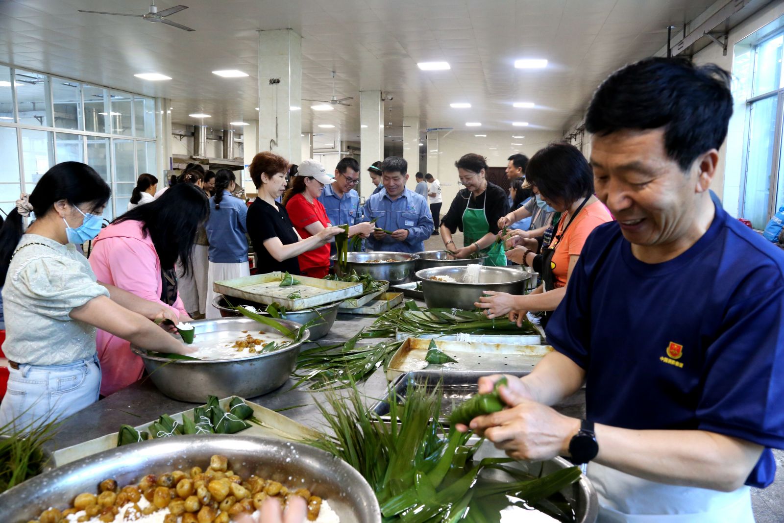 活動現(xiàn)場,食堂工作人員將提前準(zhǔn)備好的糯米、粽葉、棉線、剪刀等材料一一擺放,大家圍在一起互相幫助、密切交流,卷葉、放米、裹葉、扎線等動作一氣呵成。經(jīng)過一天的忙碌,在眾人的巧手制作下,1600多個造型各異的粽子誕生了,活動現(xiàn)場洋溢著歡聲笑語。食堂的廚師加班加點將粽子和鴨蛋全部煮熟,涼透保存好,保證了6月7日中午就餐窗口粽子和鴨蛋的特色供應(yīng)。
