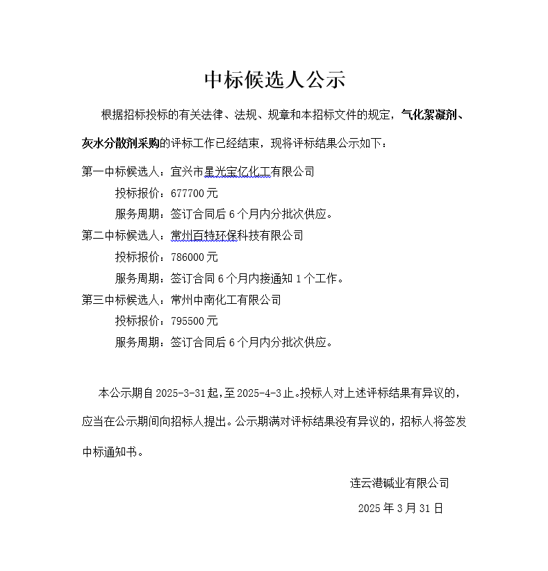氣化絮凝劑、灰水分散劑采購中標(biāo)候選人公示